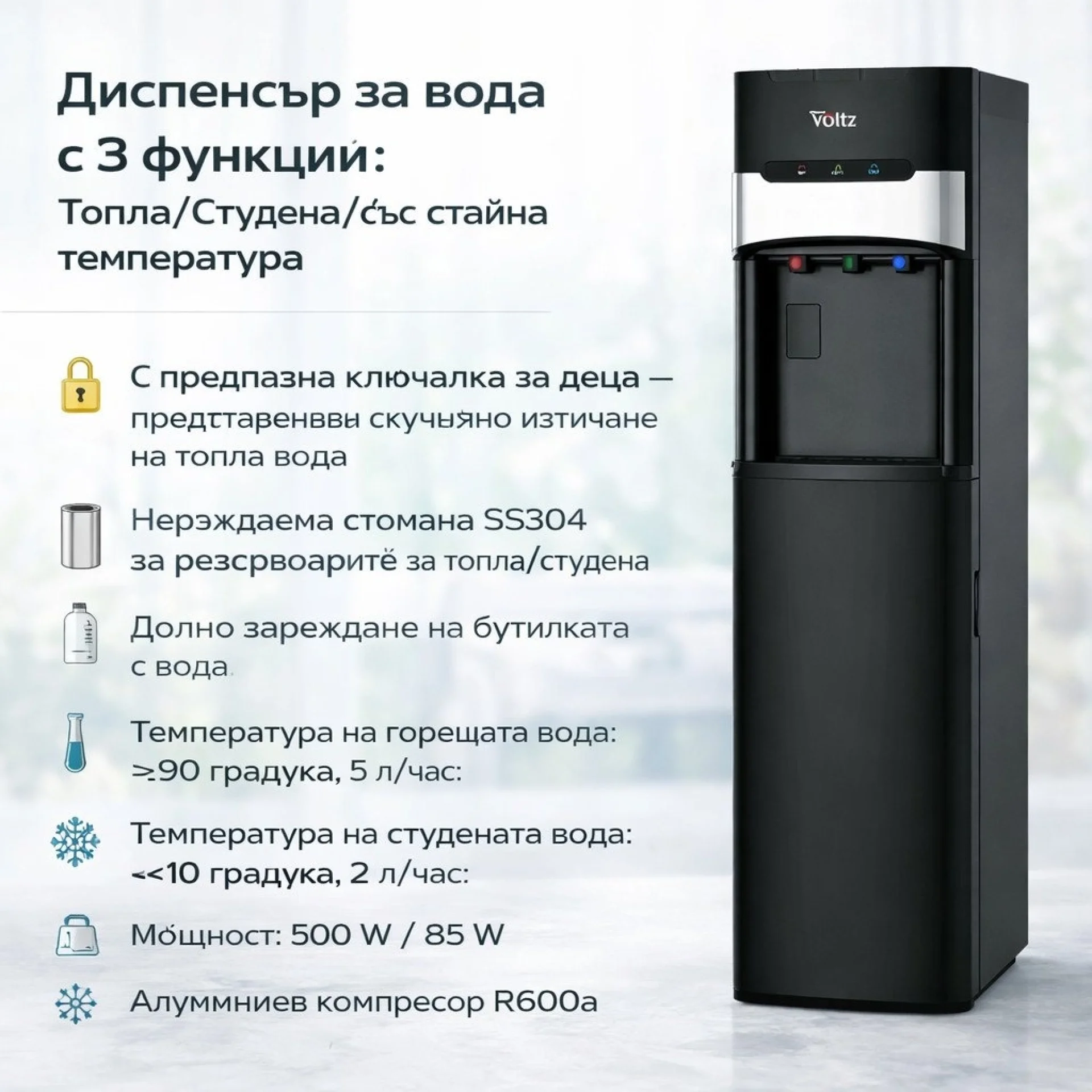 Топла/Студена/със стайна температура С предпазна ключалка за деца - предотвратява случайно изтичане на топла вода Температура на горещата вода и капацитет при нагряване: ≥90 градуса 5л. / час Температура на студената вода и капацитет при охлаждане: ≤10 градуса 2л. / час Резервоар за топла и студена вода от неръждаема стомана SS304 Мощност при нагряване: 500W Mощност при охлаждане: 85W. Технология на охлаждане: с алуминиев компресор R600a. Захранващо напрежение: 220~240V~, 50/60Hz. Долно зареждане на бутилката с вода Стилен дизайн с декоративни елементи от неръждаема стомана Диспенсърът за вода с 3 функции е практично и модерно решение за всеки дом или офис. Осигурява топла, студена и вода със стайна температура, което го прави изключително удобен за ежедневна употреба. Уредът разполага със защита за деца, която предотвратява случайно изтичане на гореща вода и гарантира безопасност при използване. Благодарение на висококачествените резервоари от неръждаема стомана SS304, водата остава чиста и безопасна за консумация. С мощност от 500 W при нагряване и 85 W при охлаждане, както и компресорно охлаждане с екологичен агент R600a, диспенсърът осигурява ефективна и икономична работа. Долното зареждане на бутилката прави подмяната лесна и удобна, без необходимост от вдигане на тежки туби. Стилният дизайн с декоративни елементи от неръждаема стомана допълва визията и се вписва перфектно във всеки интериор. Топла, студена и нормална вода – всичко в един уред! Защита за деца за максимална безопасност Комфорт и удобство всеки ден! |