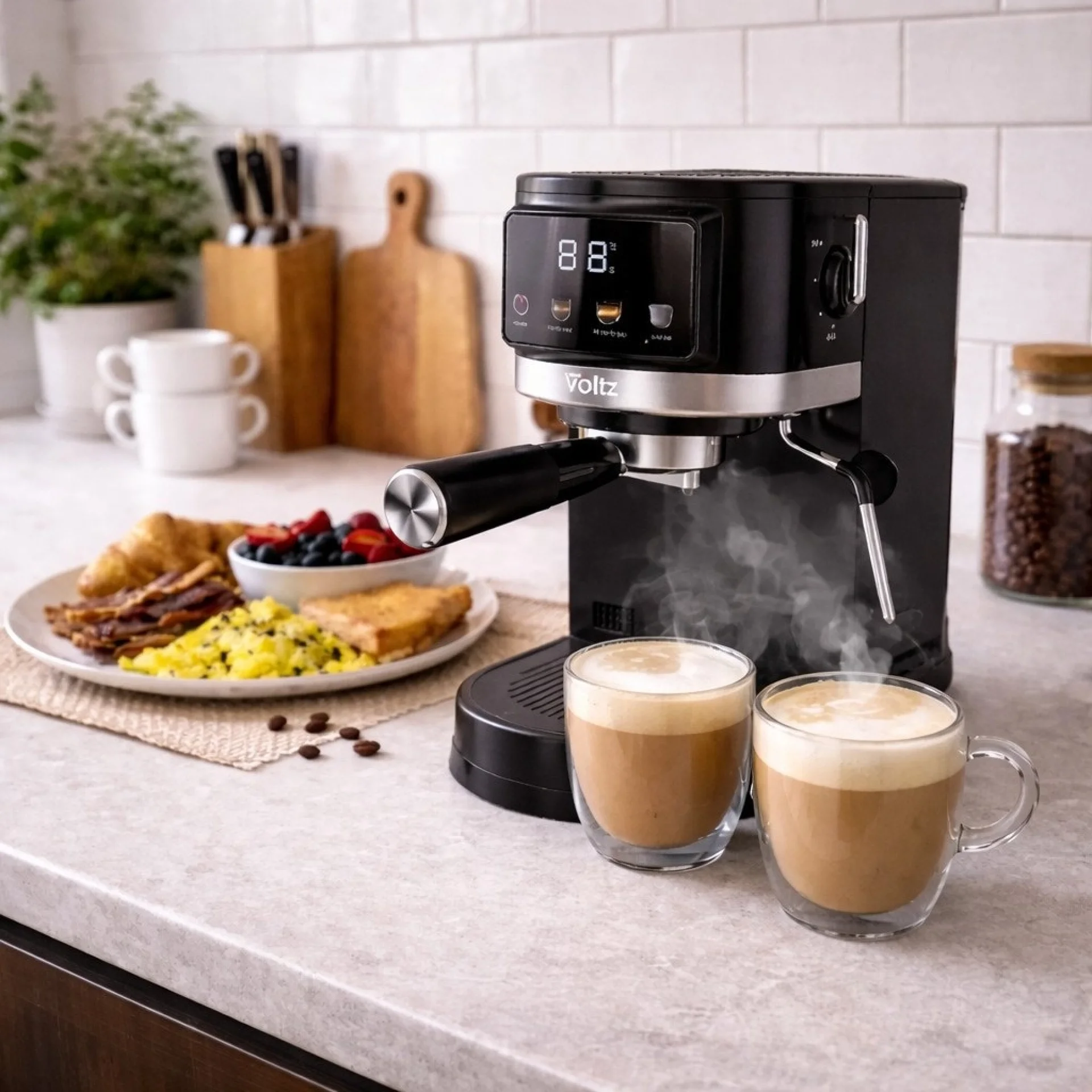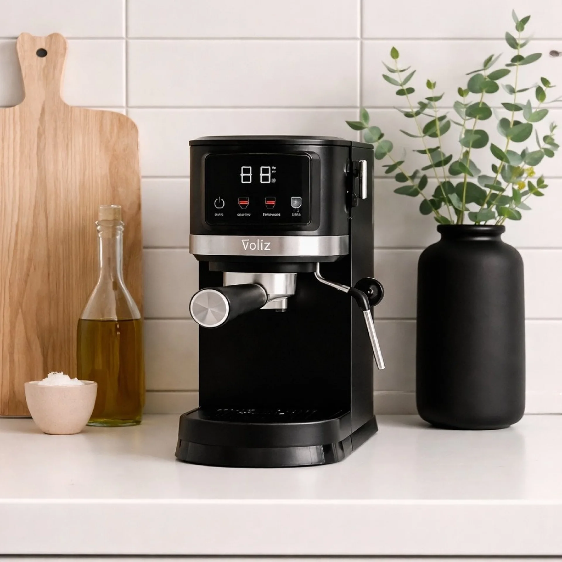 Еспресо машина Oliver Voltz – професионален вкус у дома Насладете се на истинско кафе изживяване с еспресо машината Oliver Voltz – създадена за любителите на качественото кафе. С мощна 20-барова помпа и високоефективен алуминиев бойлер, уредът осигурява плътно еспресо с богата крема и наситен аромат. Благодарение на функцията за пара можете лесно да приготвяте както класическо еспресо, така и кремообразно капучино. Двустепенният филтър и специалният крема диск допринасят за перфектен вкус при всяка чаша. Съвременният LED дисплей и интуитивното управление правят работата бърза и удобна, а компактният и стилен дизайн се вписва идеално във всяка кухня. Основни предимства:✔ 20 бара налягане за професионално кафе Характеристики:• Помпа с налягане 20 бара Технически данни:• Захранване: 220–240 V, 50/60 Hz |