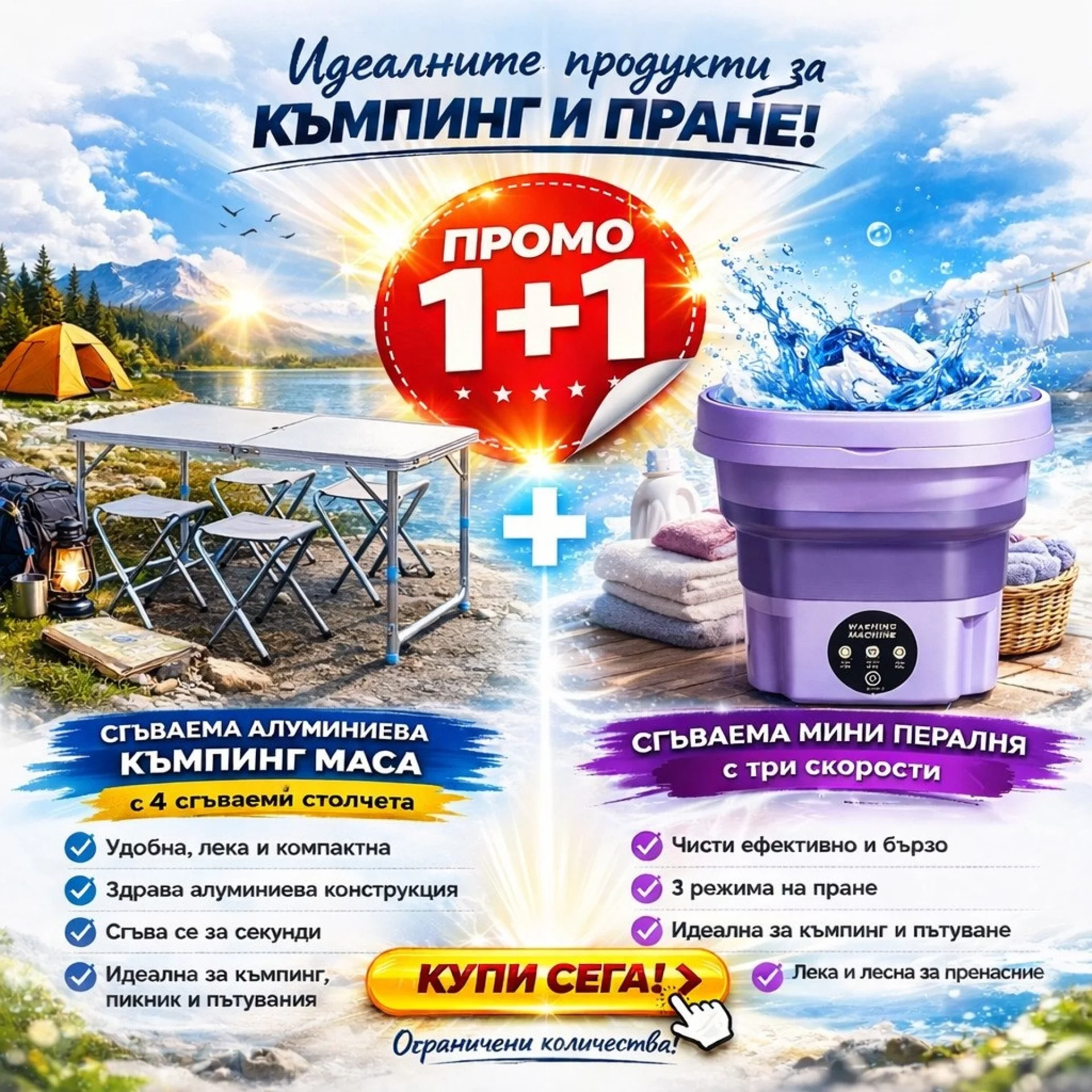 Практичен комплект за всяко пътуване – сгъваема къмпинг маса с 4 столчета и компактна мини пералня. Идеалното решение за къмпинг, пикник, каравана или ежедневна употреба.