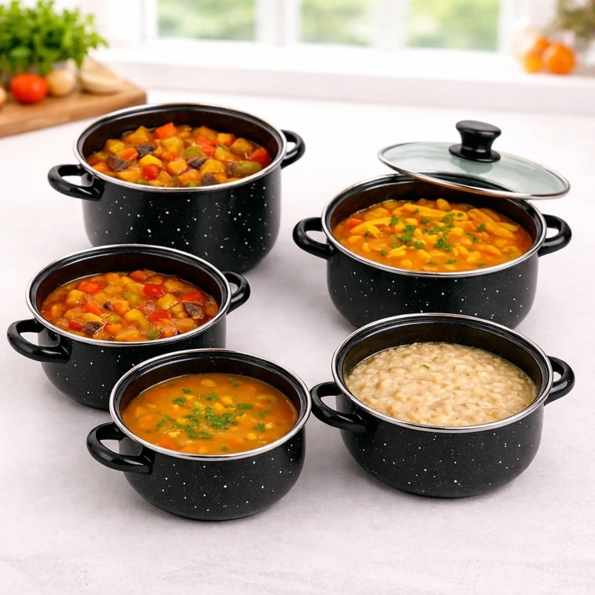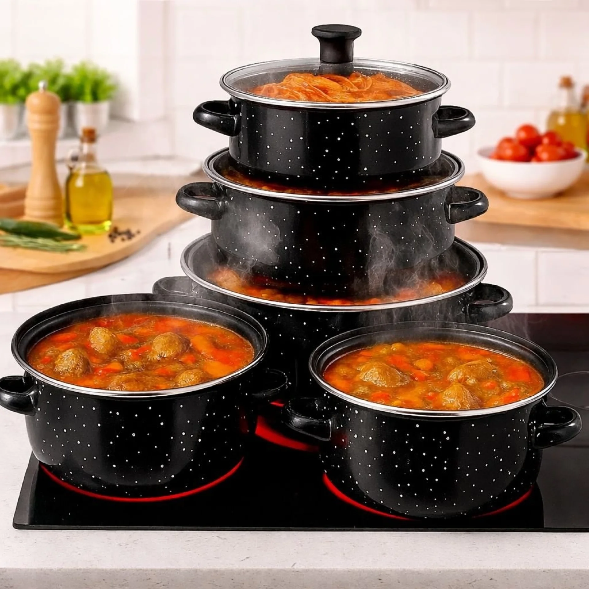 Открийте удобството и качеството с този практичен комплект от 5 тенджери с емайлирано покритие – създаден за вкусно, здравословно и лесно готвене всеки ден. Комплектът включва тенджери с различни размери, подходящи за приготвяне на разнообразни ястия – от супи и сосове до основни ястия за цялото семейство. Благодарение на емайлираното покритие храната не влиза в директен контакт с метала, което запазва естествения вкус и прави готвенето по-безопасно. Тенджерите са съвместими с повечето видове котлони и са изключително лесни за поддръжка, включително подходящи за съдомиялна машина. Здравата изработка гарантира дълъг живот и надеждност при ежедневна употреба. Стъклените капаци позволяват да следите процеса на готвене без да губите топлина, което прави готвенето по-ефективно и удобно. Основни предимства:✔ Емайлирано покритие за по-здравословно готвене Характеристики:• Комплект: 5 тенджери + 5 стъклени капака Размери и вместимост:• 16 см / 7,5 см – 1,3 л |