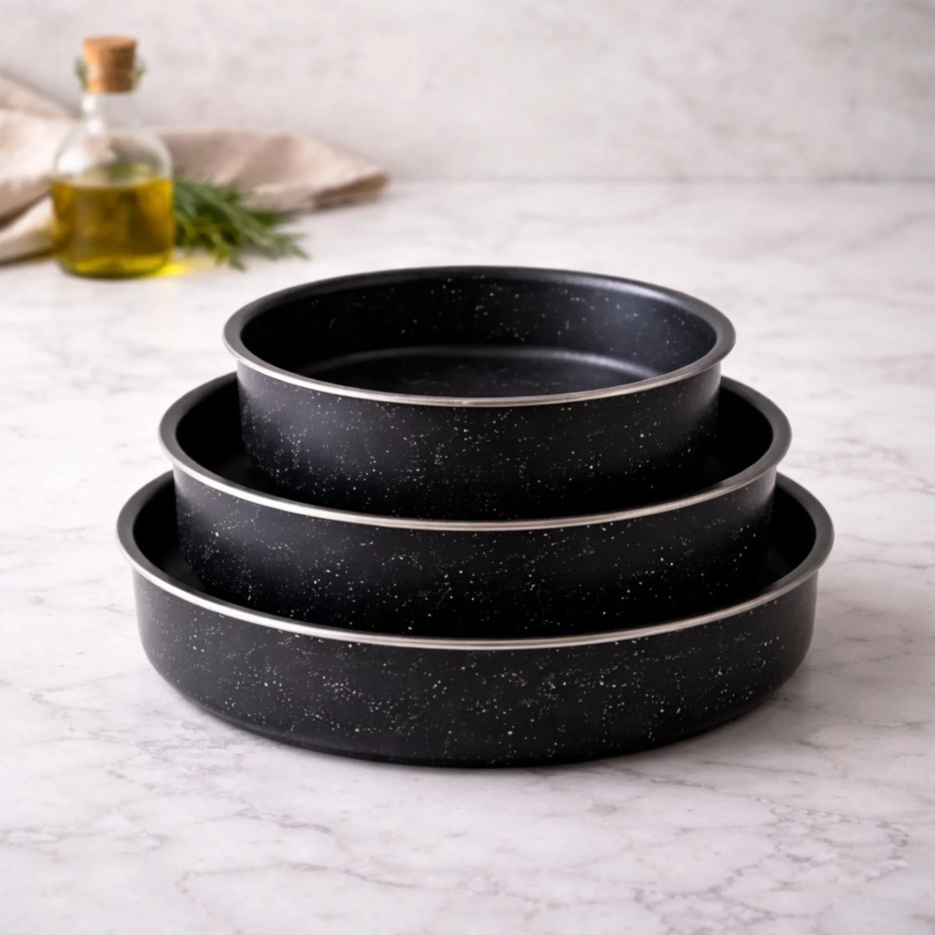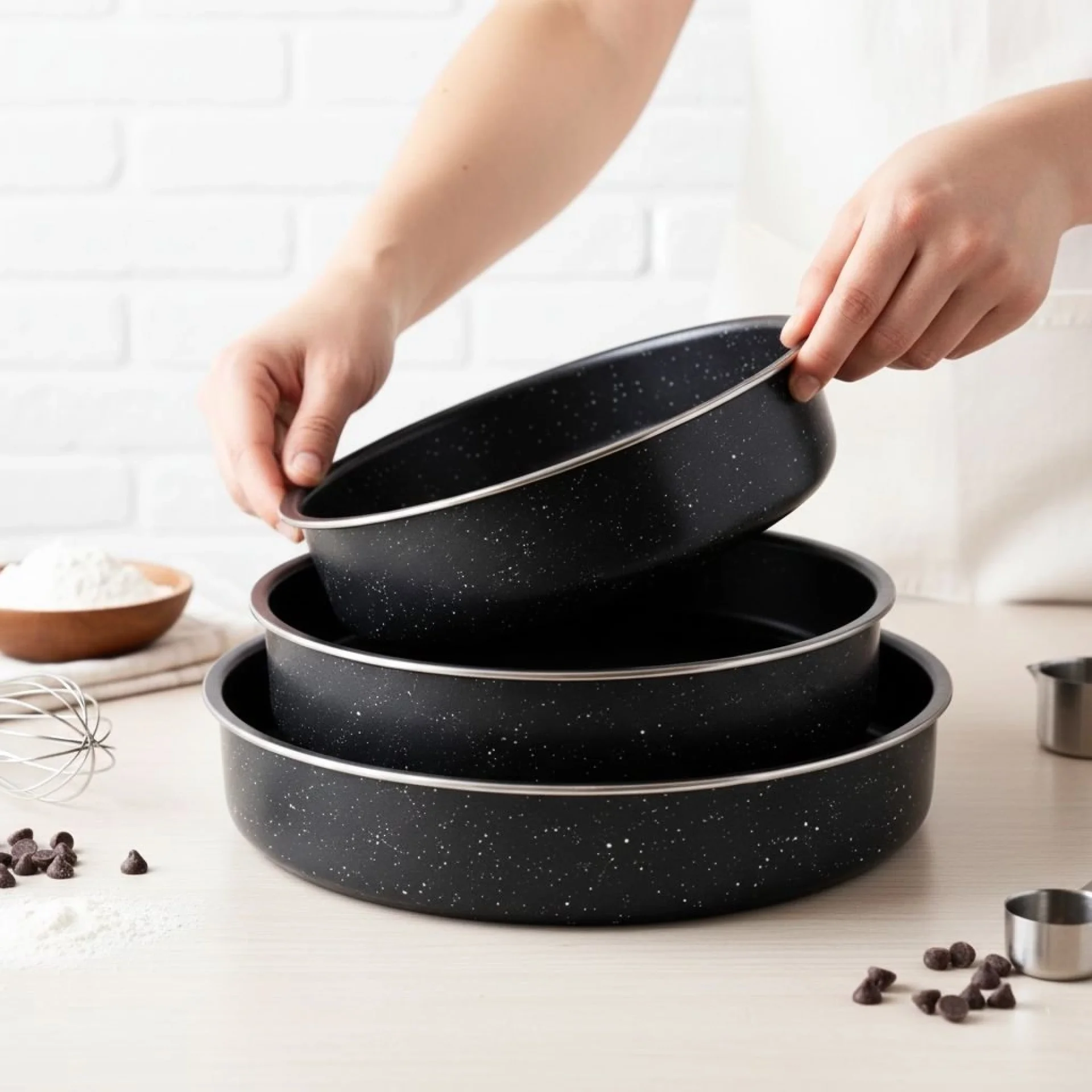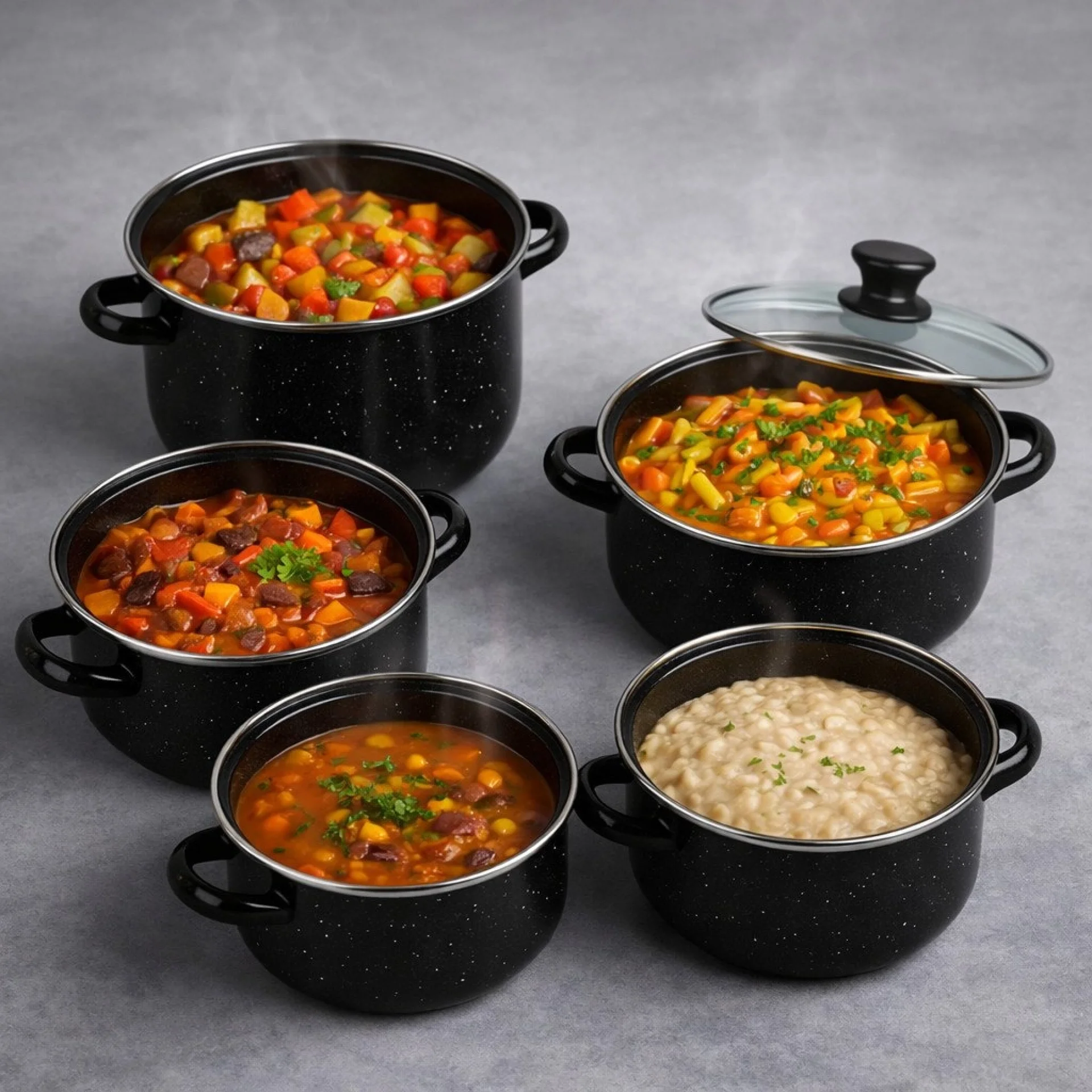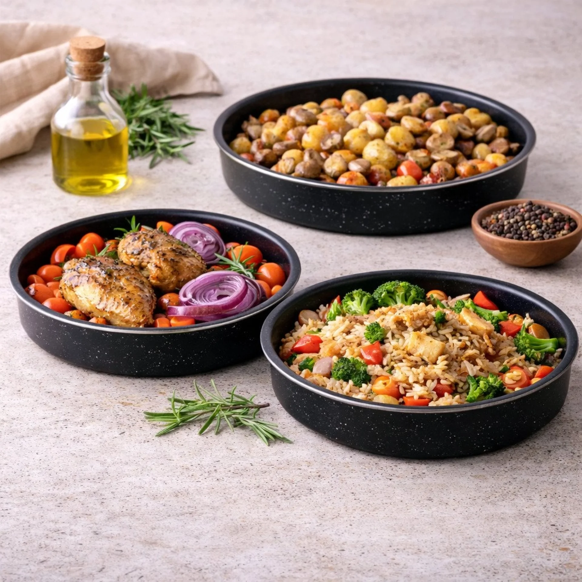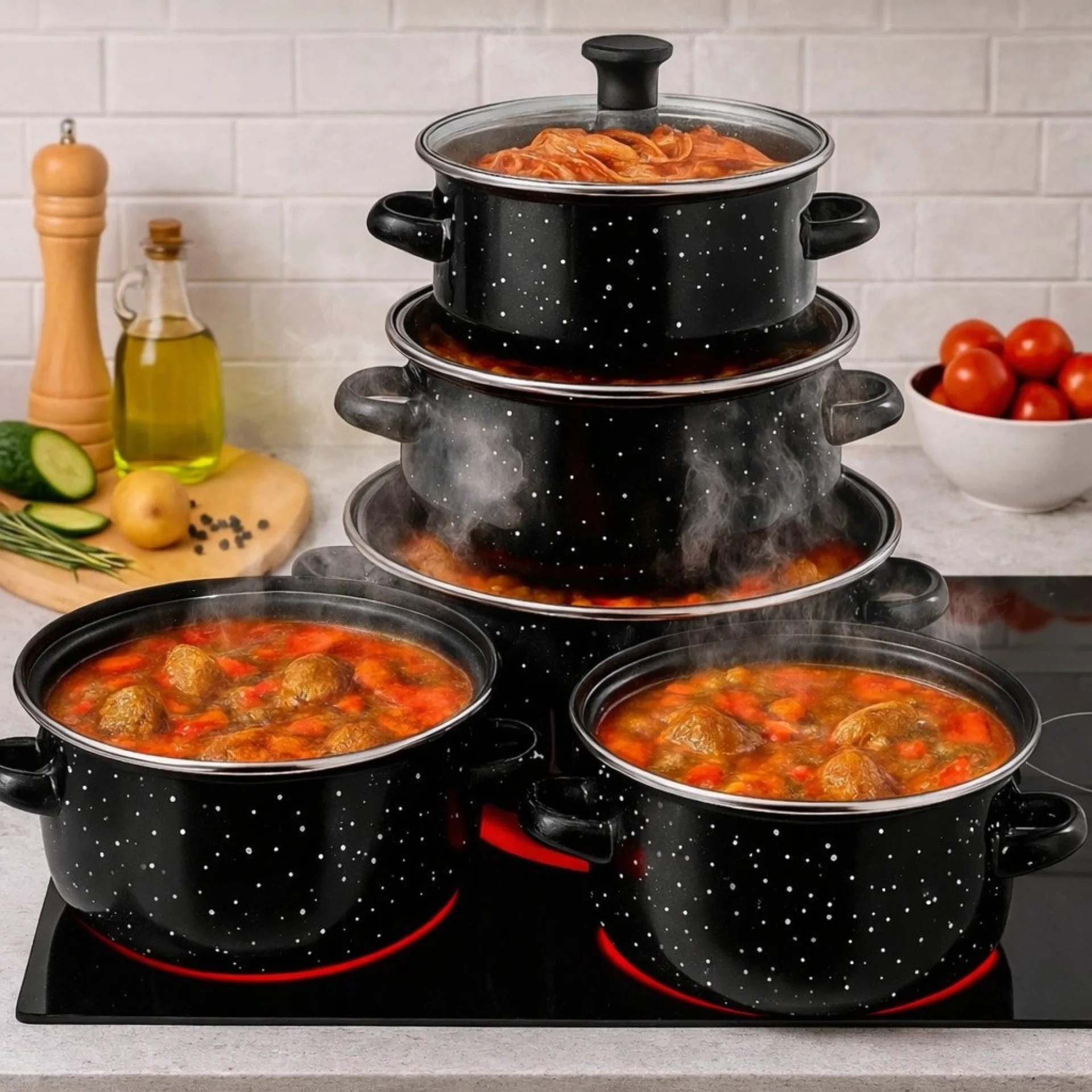 Практичен и функционален промо комплект за кухня, който комбинира 5 черни емайлирани тенджери със стъклени капаци и 3 дълбоки тави за печене Rosberg – перфектно решение за ежедневно готвене и печене у дома. Комплектът черни тенджери включва 5 броя с размери Ø16 см, Ø18 см, Ø20 см, Ø22 см и Ø24 см, с дълбочини съответно 7.5 см, 8.5 см, 10 см, 11 см и 11.5 см. Те са изработени от висококачествен материал с устойчиво емайлирано покритие, което предпазва храната от директен контакт с метала и допринася за по-здравословно приготвяне и запазване на естествения вкус. Черните емайлирани тенджери са изключително издръжливи, лесни за поддръжка и подходящи за използване върху газови, електрически, халогенни и стъкло-керамични котлони, както и за почистване в съдомиялна машина. Комплектът включва и 5 стъклени капака за удобен контрол по време на готвене. Комплектът тави за печене Rosberg R51222MR24 включва 3 дълбоки тави с диаметър Ø24 см, Ø26 см и Ø28 см и дълбочина 5.5 см. Изработени са от здрава въглеродна стомана с мраморно незалепващо покритие, което гарантира равномерно изпичане и предотвратява залепването на храната. Тавите са лесни за почистване, подходящи за съдомиялна машина и не съдържат PFOA, което ги прави безопасен и екологичен избор. Идеални са за приготвяне на месо, зеленчуци, тестени изделия и разнообразни домашни печива. Отличен избор за всеки, който търси качествени черни тенджери и практични тави за печене в един комплект. |